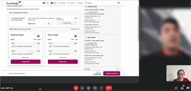 Due to the epidemic, I conducted the user testing remotely. A recruiting screener, consent form, and test script were all produced prior to the interview. During the session, two different airline websites were tested. The usability testing offered extensive qualitative insights into the booking process as well as additional information about the users' experiences.