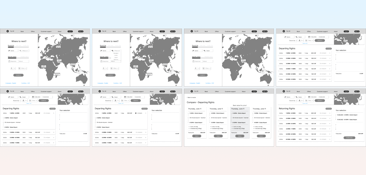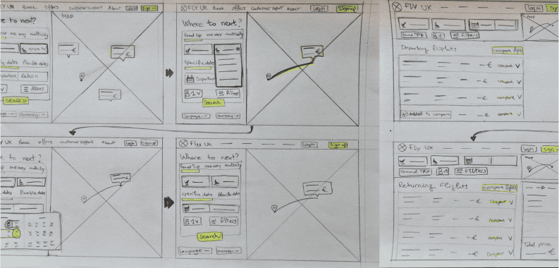 Following the user flow, I gathered all of the analysis data for sketching the screen states of the design , tackling the current booking process issues of airlines sites. Sketching is a quick and cheap approach to represent ideas. It is a necessary stage before further prototyping.